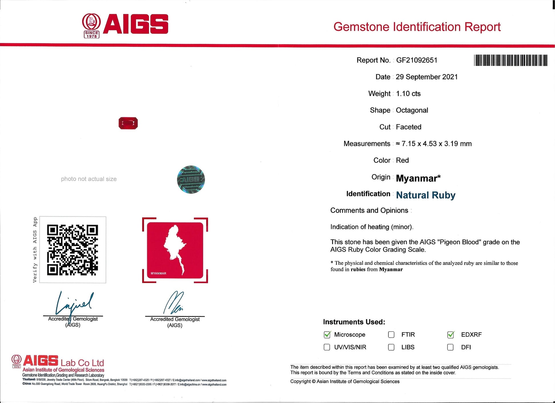 Weighing 1.10 carats, this radiant octagon-cut ruby boasts a deep red hue that is often referred to as “Pigeon’s Blood,” signifying its remarkable color intensity and quality.