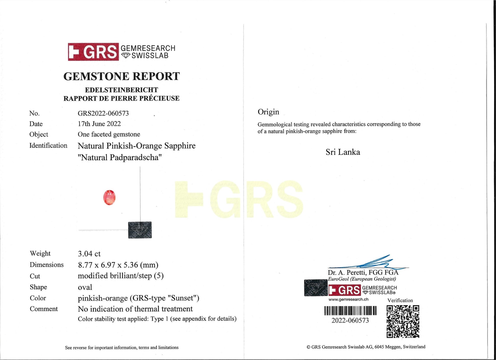 This gemstone is a Padparadscha Sapphire, a unique and highly prized variety known for its exquisite blend of pink and orange hues. With a weight of 3.04 carats, it presents an elegant oval shape, making it suitable for various jewelry applications.