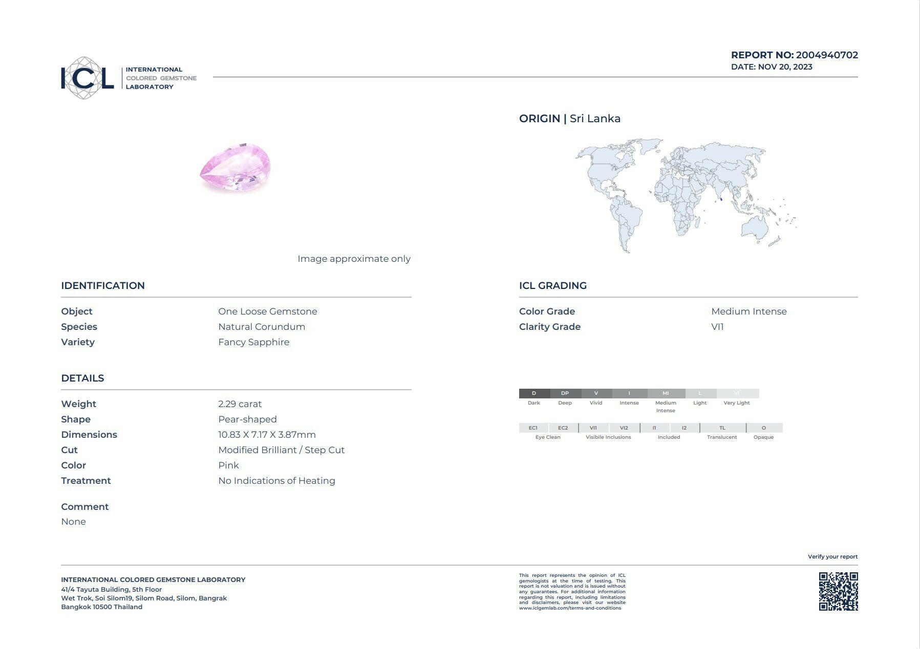 Unheated Pink Sapphire, with a substantial weight of 2.30 carats. This exquisite gem exhibits a mesmerizing blend of pink and peach hues that gracefully dance within its pear-shaped silhouette, measuring 10.84mm in length, 7.20mm in width, and 3.90mm in depth.